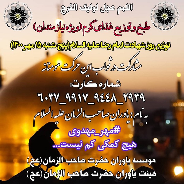 به مناسبت روز شهادت امام رضا (ع) موسسه یاوران صاحب الزمان در نظر دارد به لطف خدا و با کمک خیرین محترم به طبخ غذا و توزیع آن بین نیازمندان بپردازد.