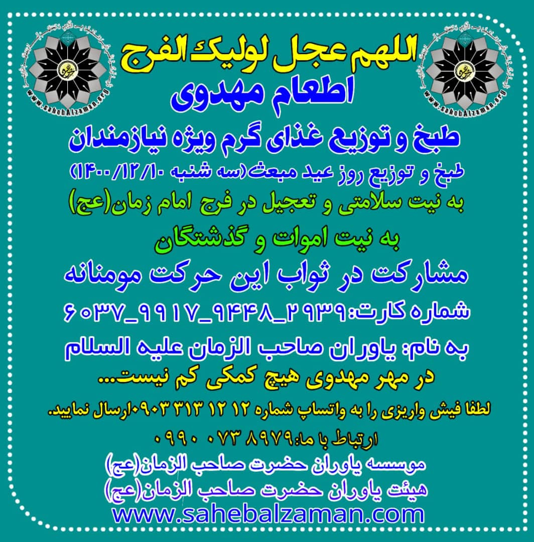 خانه › اخبار › اطعام مهدوی در روز عید مبعث 10 اسفند 1400اطعام مهدوی در روز عید مبعث 10 اسفند 1400 نویسنده: مدیر محتوا 6 اسفند 1400 0نظر دسته بندی : اخبار , کمک به نیازمندان شما عزیزان نیز می توانید در ثواب این کار خیر شرکت نمایید. 0 نویسنده:مدیر محتوا مطالب مرتبط گزارش کمک های واریزی به حساب خانواده های نیازمندان در دهه اول بهمن ماه سال ۱۴۰۴ مدیر محتوا 10 بهمن 1404 گزارش کمک های مردمی به نیازمندان در پاییز 1403 مدیر محتوا 13 مهر 1403 تهیه و توزیع نوشت افزار بین دانش آموزان نیازمند – مهر 1403 مدیر محتوا 6 مهر 1403 گزارش ذبح و توزیع 55 مرغ در روز اول ماه صفر – مرداد 1403 مدیر محتوا 19 مرداد 1403 طرح قربانی مرغ و توزیع بین نیازمندان – اول ماه صفر، مرداد 1403 مدیر محتوا 9 مرداد 1403 گزارش ذبح و توزیع گوشت گوسفند بین نیازمندان – تیرماه 1403 مدیر محتوا 29 تیر 1403 پاسخی بگذارید لغو پاسخنشانی ایمیل شما منتشر نخواهد شد. بخشهای موردنیاز علامتگذاری شدهاند *دیدگاه نام * ایمیل * وب سایت ذخیره نام، ایمیل و وبسایت من در مرورگر برای زمانی که دوباره دیدگاهی مینویسم. آخرین مقالات گزارش کمک های واریزی به حساب خانواده… 1404/11/10 مسابقه بزرگ کشوری گل نرگس – بهمن… 1404/11/04 گزارش کمک های مردمی به نیازمندان در… 1403/07/13 تهیه و توزیع نوشت افزار بین دانش… 1403/07/06 گزارش ذبح و توزیع 55 مرغ در… 1403/05/19 محبوب ترین عنوان ها در مسابقه نقاشی مهدوی شرکت کنید 1399/02/07 خلاصه ای از زندگی امام مهدی (عج) 1399/02/27 توسل حاج شیخ عبد ا…مجد و نجات… 1399/02/03 ولادت امام زمان علیه السلام چگونه اثبات… 1399/02/27 حمایت های مالی از فعالیتهای موسسه یاوران… 1399/12/12