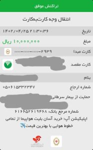 با حمایت شما خیرین محترم مبلغ ده میلیون ریال به حساب بیمار سرطانی جهت تهیه دارو واریز شد.